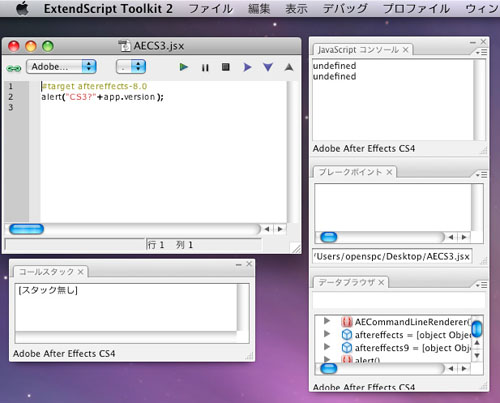 AfterEffects CS3にはJavaScriptプログラムを制作、実行、デバッグできるExtendScript Toolkit 2が付属しています。ExtendScript Toolkit 2はファイルメニューのスクリプト→スクリプトエディタを開く...を選択すると起動することができます。AfterEffects CS3からスクリプトを実行するだけでなく、ExtendScript Toolkit 2からも実行することができます。この場合、実行するアプリケーション名AfterEffects CS3を選択してから再生ボタンを押します。