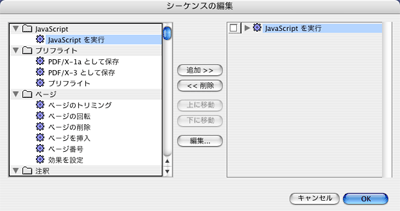 バッチ処理とJavaScriptの組み合わせで異なるフォルダにあるPDFファイルを連結する事ができます。ここでは3種類のPDFを連結して別フォルダに保存する処理を行います。 ただし、セキュリティが施されているPDFの場合は自動的に開く事ができずにファイルの連結は行われませんので注意してください。 まず、3種類のPDFファイルは以下のような階層になっているものとします。 ![]() 次にAcrobatを起動し、アドバンストメニューから「バッチ処理...」を選択します。 ![]() 「新規シーケンス...」ボタンをクリックします。 ![]() シーケンス名を入力します。 ![]() コマンドシーケンスの選択で「コマンドの選択...」ボタンをクリックします。 ![]() 左側のカテゴリリストにある「JavaScriptを実行」を選択し「追加>>」ボタンをクリックします。 ![]() 「編集...」ボタンをクリックします。 ![]() JavaScriptエディタが表示されます。 ![]() 以下の命令を入力します。赤文字部分が連結するファイルのパスになります。必要に応じて変更してください。 this.insertPages({nPage: this.numPages-1, cPath: "/00Result/B/"+this.documentFileName}); this.insertPages({nPage: this.numPages-1, cPath: "/00Result/C/"+this.documentFileName}); ![]() 「OK」ボタンをクリックします。 ![]() コマンドを実行する対象「選択したフォルダ」にします。 ![]() 「選択...」ボタンをクリックします。 ![]() 一番最初のPDFがあるフォルダを指定します。 ![]() 出力場所の選択で「指定のフォルダ」を選択します。 ![]() 「選択...」ボタンをクリックします。 ![]() 保存先フォルダを指定します。 ![]() 「OK」ボタンをクリックします。 ![]() 「シーケンスを実行」ボタンをクリックして処理を実行します。 ![]() ダイアログが出るのでOKボタンをクリックします。 ![]() 実行後にPDFを開いて確認します。 ![]() |