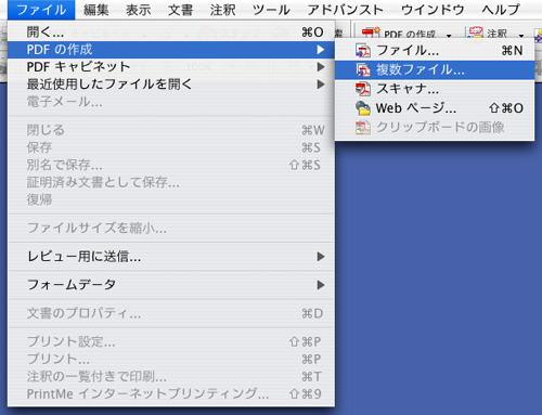 ファイルメニューからPDFの作成→複数ファイル...を選択します。