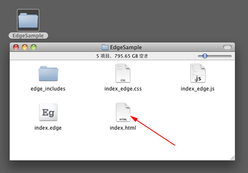 フォルダ内に各種ファイルが作成されます。HTMLファイルをブラウザで開くか、ブラウザアイコンにドラッグ&ドロップします。