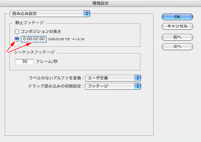 静止画をコンポジションに配置するとコンッポジションの秒数や特定の長さになってしまう場合は環境設定の読み込みの静止フッテージを確認します。コンポジションの長さに合わせるか、特定の秒数に設定してからコンポジションに配置します。