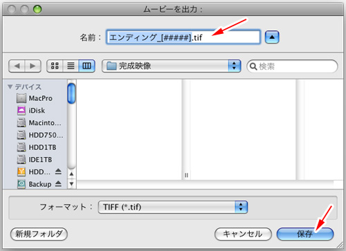 形式でTIFFやJPEGシーケンスなど静止画フォーマットを選択します。
