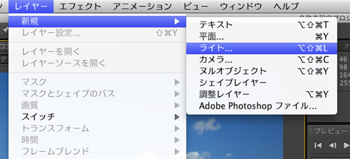 レイヤーメニューから「新規」→「ライト...」を選択します。