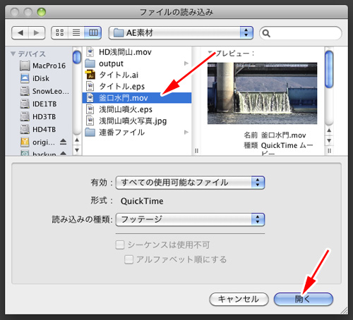 プロジェクトに映像ファイルが読み込まれます。QuickTimeムービーであってもコーデックによっては映像ファイルとして読み込めても表示されない場合があります。その場合には一度変換して読み込めるコーデックにしてからAfterEffectsに読み込ませます。