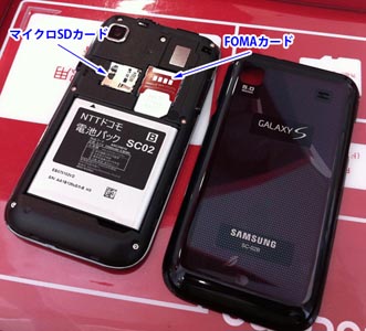 NTTドコモショップでFOMAカードは入れてくれます。また、マイクロSDカードも必要であれば写真の場所に差し込みます。Galaxy Sの背面カバーは本体の中央下部に小さな穴があり、そこに爪をひっかけながら開けます。少し力を入れないと開かないかもしれません。カードを差し込んだら背面カバーを本体に取りつけて本体の準備完了です。