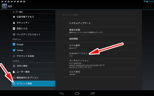 画面を下に移動させたら「タブレット情報」と表示されている項目をタッチします。Nexus 10に関する情報が表示されます。ここでAndroidバージョンの項目を素早く3回タッチします。とにかく、画面が切り替わるまでぽこぽことタッチしてください。