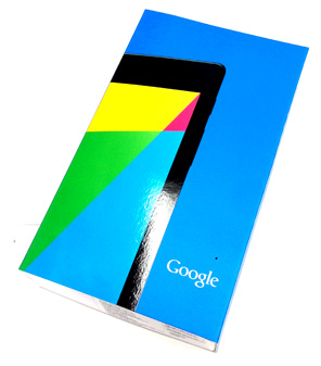 するとNexus 7が入った箱が出てくるので背面のテープをはがすか切断し、箱のふたを上に持ち上げます。するとNexus 7がでてきます。2012年モデルは外枠が銀色ですが、2013モデルは黒色になっています。なお、ここで使用しているのは16GBモデルです。