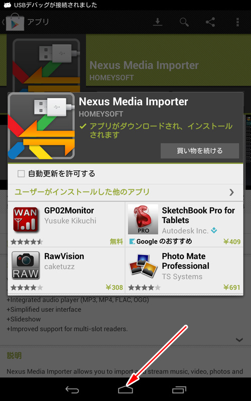 Nexus 7ではSDカードスロットがありません。このため、SDカードを利用できるハードウェアを追加する必要があります。その際に便利なのがNexus Media Importerです。なお、Nexus Media Importerは有料(246円/2012年12月11日現在)です。