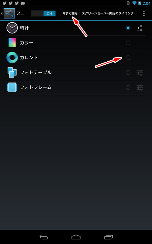 スクリーンセーバーの種類を選択します。どのような表示になるかを確認するには画面上にある「今すぐ開始」ボタンをタッチします。