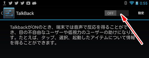 Nexus 7ではユーザー補助機能として音声でアナウンスしてくれる機能があります。まず、ホーム画面で矢印で示すボタンをタッチします。