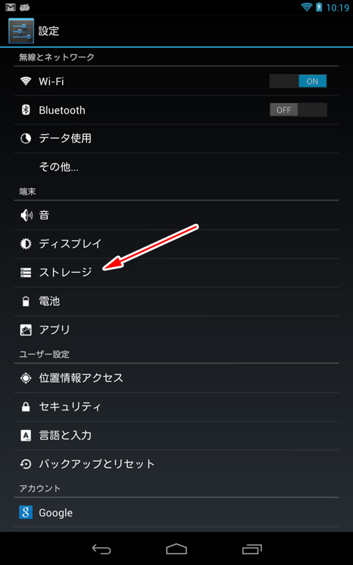 Nexus 7の内部のストレージ容量を確認したい場合があります。この場合、ホーム画面にある矢印で示すボタンをタッチします。