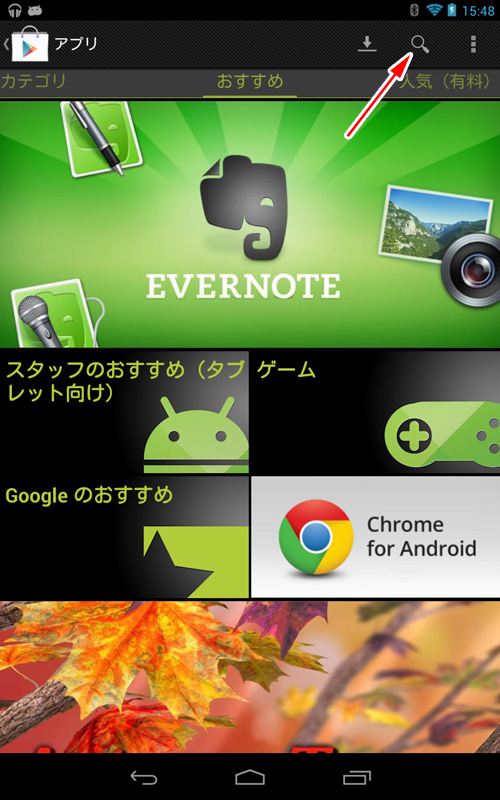Google Playの画面が表示されます。「アプリ」と表示されている項目をタッチします。
