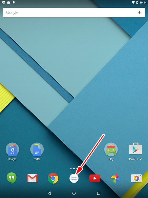 まず、ホーム画面で矢印で示すボタンをタッチします。