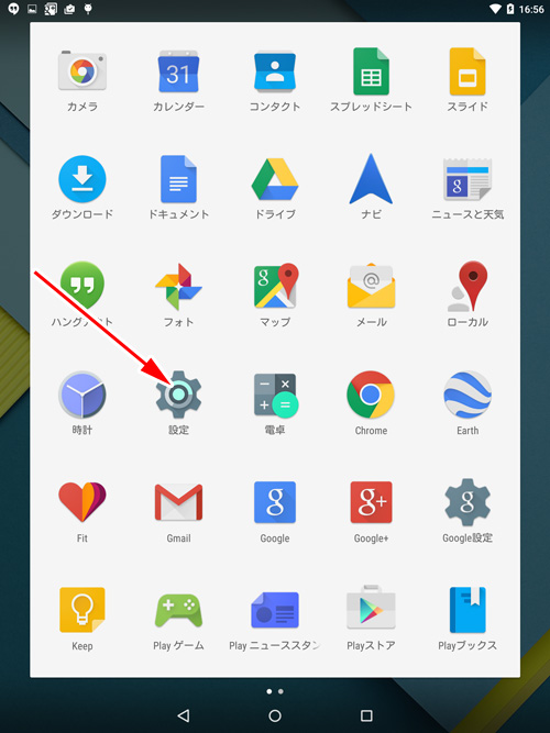 Nexus 9に入れたアプリを削除(アンインストール)する方法について説明します。まず、ホーム画面にある矢印で示すボタンをタッチします。