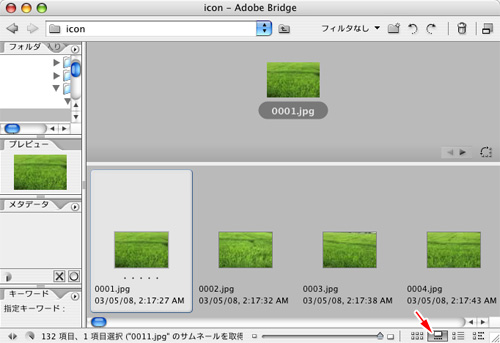 Bridgeは4つのファイル表示モードが用意されています。右下に並んでいる4つのボタンをクリックすることで表示モードが変わります。