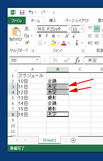 次にCtrlキーを押したままB4のセルとB8のセルをクリックして選択します。選択したら文字を入力します。