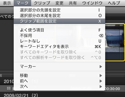 イン点/アウト点を解除したい映像を選択します。このまま左右にドラッグして解除する(イン点、アウト点なし)にすることもできます。