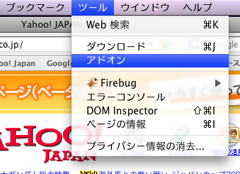 アドオンを無効にするにはツールメニューから「アドオン」を選択します。