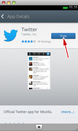 Marketplaceの画面になります。ここではTwitterアプリをインストールしてみます。Twitterのシンボルである鳥が描かれたボタンをタッチします。もし、見当たらない場合は画面右上にある虫眼鏡のアイコンをタッチして検索してください。