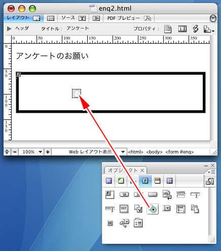 オブジェクトパレットの入力フォームのカテゴリからラジオボタンのアイコンをドラッグドロップして配置します。
