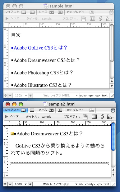 選択したテキストや画像上でコマンドキーを押したまま、他のページ内のアンカーを設定したいところにマウスを移動させてからマウスボタンを離します。
