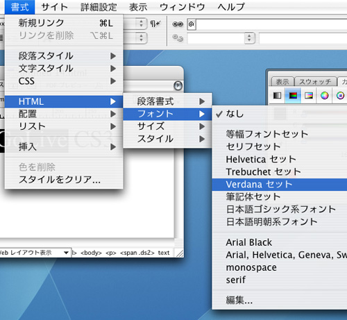 書式メニューから「HTML」→「フォント」で表示されるフォントセットを選択します。新たに定義(設定)する場合には「編集...」を選択します。