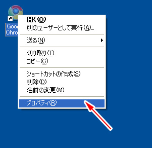 Google Chromeのショートカットアイコンを作成します。そのアイコン上で右ボタンをクリックし表示されるメニューから「プロパティ」を選択します。