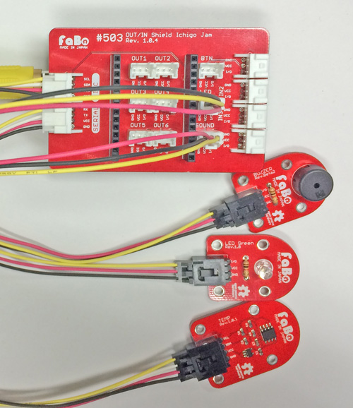 まず、写真のように4線のI2C接続できる温度センサーをOUT/IN Shieldに接続します。次にブザーをSOUNDに接続します。LEDはLEDのところに接続します。好きな色のLEDを取り付けましょう。なお、本体のLEDで十分だという場合は特にFaBoのLEDは取り付けなくても構いません。