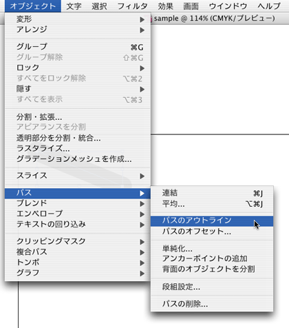 オブジェクトメニューの「パス」→「パスのアウトライン」を選択します。