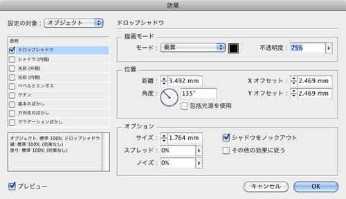 オブジェクトメニューから「効果」>「ドロップシャドウ...」を選択します。