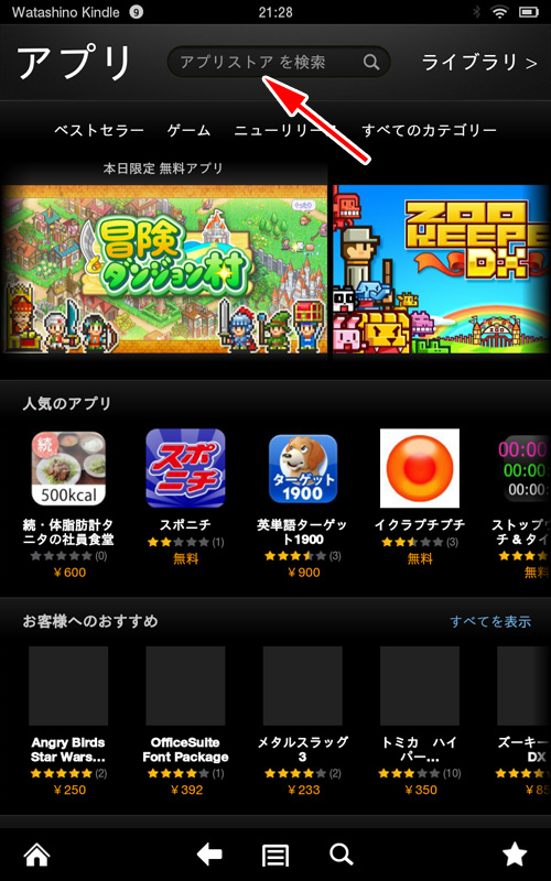 Kindle Fire HDではWi-Fiに接続できますが、複数のWi-Fiがある場合どのような電波状況(強さやチャンネルなど)を把握するアプリは入っていません。電波状況を確認するにはアプリを入れる必要があります。ここでは電波状況を確認するWiFi Overview 360アプリをダウンロードしてみます。WiFi Overview 360をダウンロードするには画面上部に表示されている「アプリ」の文字をタッチします。