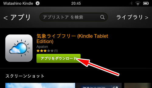 Kindle Fire HDで天気を表示するにはアプリをダウンロードする必要があります。ここでは気象ライブというアプリをダウンロードします。