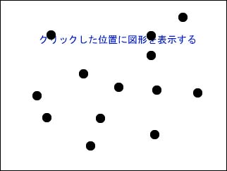 | 説 明 | クリックした位置に図形(サンプルでは丸印)を表示するには、表示する図形を作成しムービークリップにしておきます。ムービークリップにした図形に名前を付けます。サンプルではSTAMPとしています。 次にスクリプトウィンドウを開いて、コンポジションを選択しonEnterFrameイベントを選択します。そこに以下のスクリプトを入力します。 newName = "STAMP"+count; count++; x = STAMP._x; y = STAMP._y; STAMP._x = _root._xmouse; STAMP._y = _root._ymouse; STAMP.duplicateMovieClip(newName, count); STAMP._x = x; STAMP._y = y; クリック位置に表示させるためduplicateMovieClip()を使ってムービークリップを複製しクリック位置を設定します。これでクリックした位置に図形が表示されるようになります。 |
