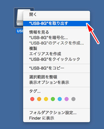 OS X Yosemiteでディスクを取り出すには、ディスクのアイコン上でマウスの右ボタンをクリックします。