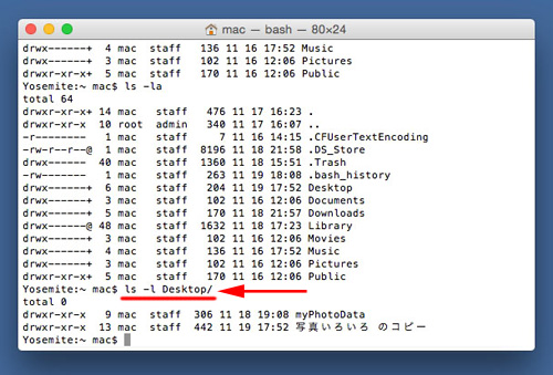 より詳しく表示するにはls -lと入力します。