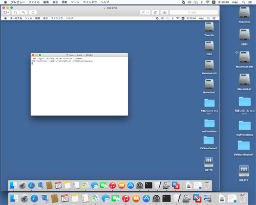 画面をキャプチャーするにはscreencaptureコマンドを使います。ターミナルで「screencapture 保存ファイル名」と入力します。