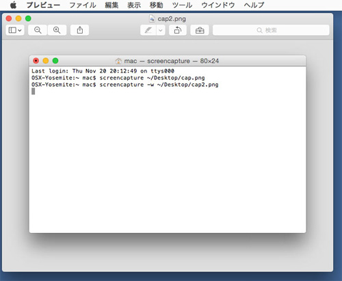 ウィンドウ単位でキャプチャーすることもできます。この場合はscreencaptureの後に-wのパラメーターを指定し、その後に保存するファイル名を指定します。