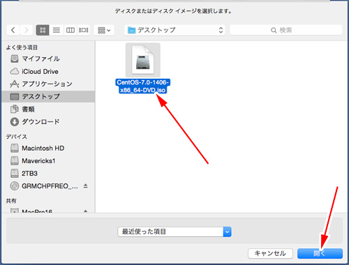 ディスクイメージを選択します。選択したら「開く」ボタンをクリックします。