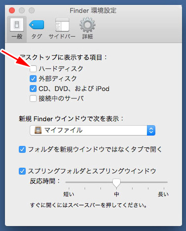 最初の状態ではデスクトップにはハードディスクのアイコンが表示されていません。これを常に表示させておくには「Finder」のメニューから「環境設定...」を選択します。