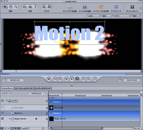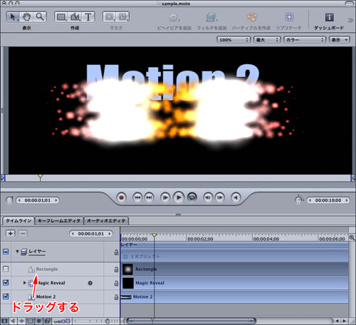 タイムラインで上に表示したいレイヤー(オブジェクト)をドラッグして上に移動させます。Motion 2では上にあるものほど手前に表示されます。