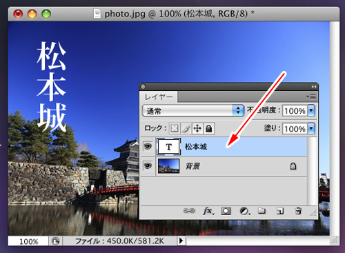 横書きにする文字のレイヤーを選択します。