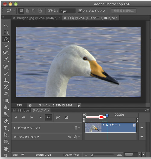 映像ファイルを読み込ませます。画面下にタイムラインが表示されるので、カレントタイムマーカーを左右にドラッグして加工したフレームを表示します。