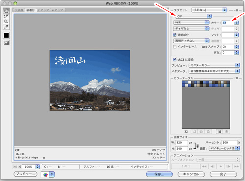 保存形式のポップアップでGIFを選択し透明の設定や使用カラー数を設定します。