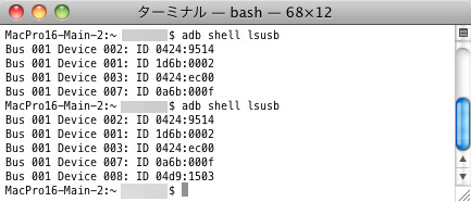 新たにUSB機器を接続してlsusbとすると接続された機器が1つ増えたのが確認できます。