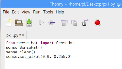 以下のようにプログラムを入力します。このプログラムはLEDの左上の点を緑色に光らせます。set_pixel()のパラメーターはX座標,Y座標,赤の輝度,緑の輝度,青の輝度の順番に指定します。座標は0〜7,輝度は0〜255の範囲で指定します。