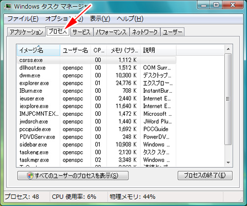 タスクマネージャーでプロセスのタブをクリックします。するとプロセスの状況が表示されます。