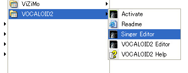 「スタート」メニューから「プログラム」→「VOCALOID2」→「Singer Editor」を選択します。