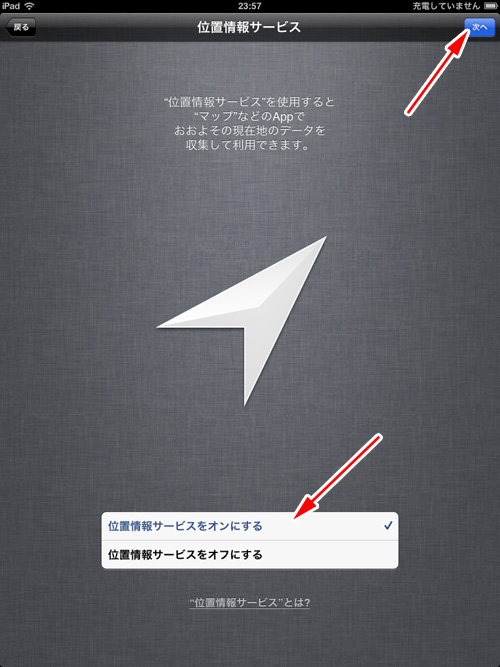位置情報を利用するかどうか決めます。決めたら画面右上にある「次へ」ボタンをタッチします。