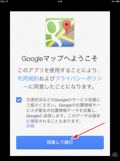 現在位置を利用するため図のようなダイアログがでます。現在の位置の利用を許可する場合は「OK」ボタンをタッチします。現在位置を利用されたくない場合は「OK」ボタンをタッチします。