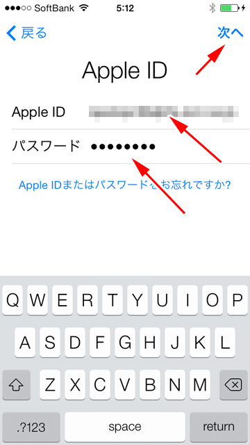 Apple IDとパスワードを入力します。入力したら「次へ」の文字をタッチします。